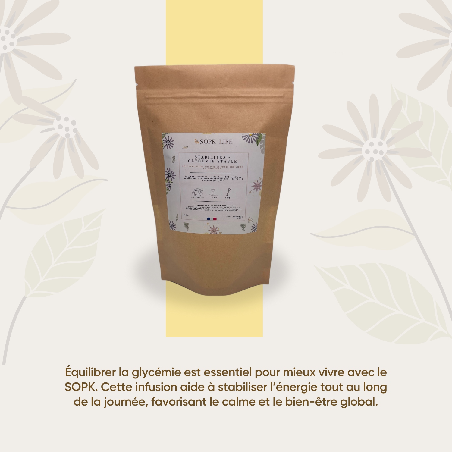 Cette tisane est une infusion à base de plantes et d’herbes naturelles, formulée pour accompagner le bien-être métabolique dans le cadre d’une hygiène de vie équilibrée, notamment chez les femmes concernées par le SOPK.