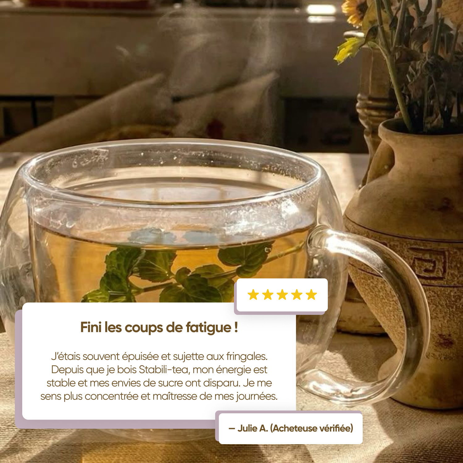 Profitez de sa saveur rafraîchissante tout en soutenant votre bien-être. Si vous souhaitez maîtriser votre glycémie et adopter un mode de vie plus équilibré, Stabili-tea est la solution parfaite.